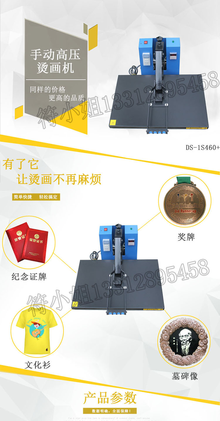 燙畫機屬于一種熱傳遞,适合可以耐高溫,圖案型且數量比較多的産品。可将各種燙畫/燙鑽經熱轉印燙在棉、麻、化纖等織物上,可進行絲網印刷、膠漿、發泡、植絨等工藝熱處理,還可将彩色标志、人像照片、風景圖案等烤制在皮革、布料、瓷闆、金屬闆等材料上,特别适合制作獎牌、紀念證牌、墓碑像、文化衫等,經濟又實用。