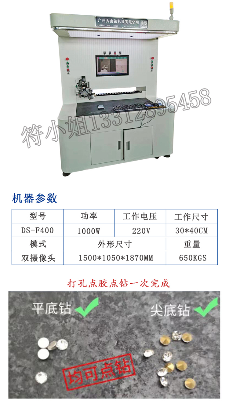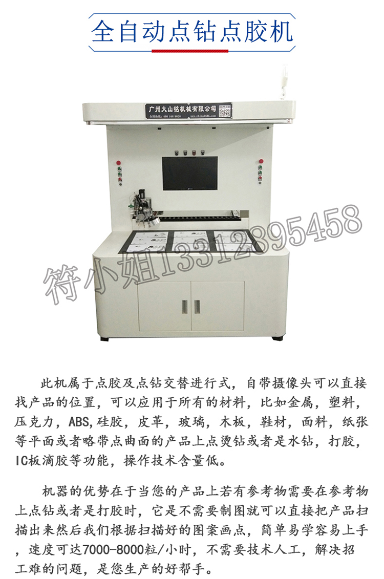 功能描述: 機器操作時點膠和點鑽交替進行,自帶攝像頭可以直接找産品的位置,可應用于金屬,塑料,壓克力,ABS,矽膠,皮革,玻璃,木闆,鞋材,面料,紙張等平面或者略帶點曲面的産品,适用于點燙鑽、水鑽,打膠,IC闆滴膠等工藝。